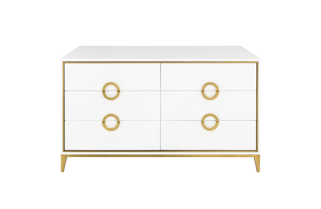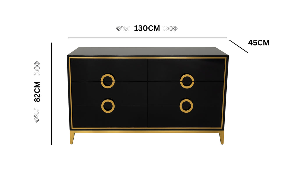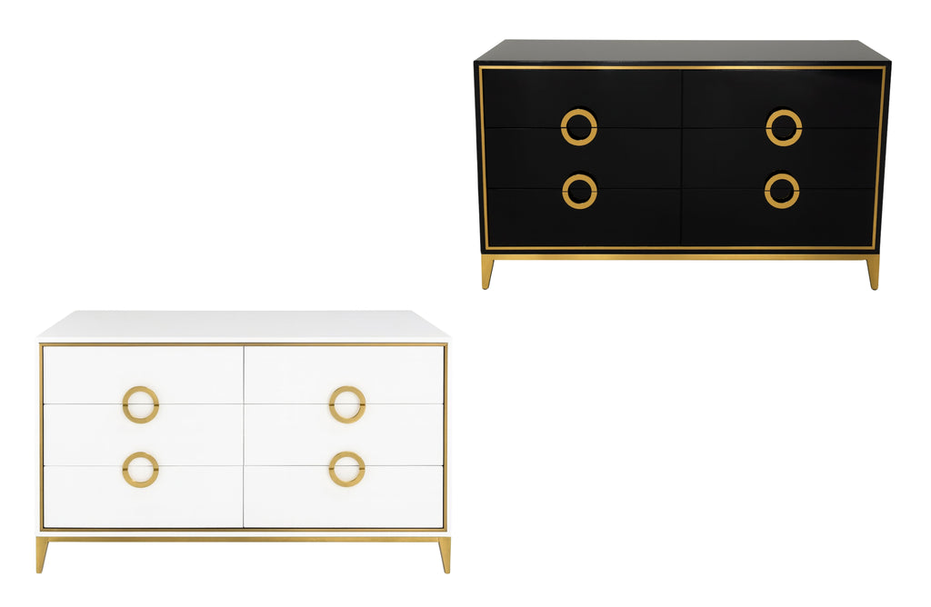 Balmain dresser set in black and white options, both with gold trim and six spacious drawers.