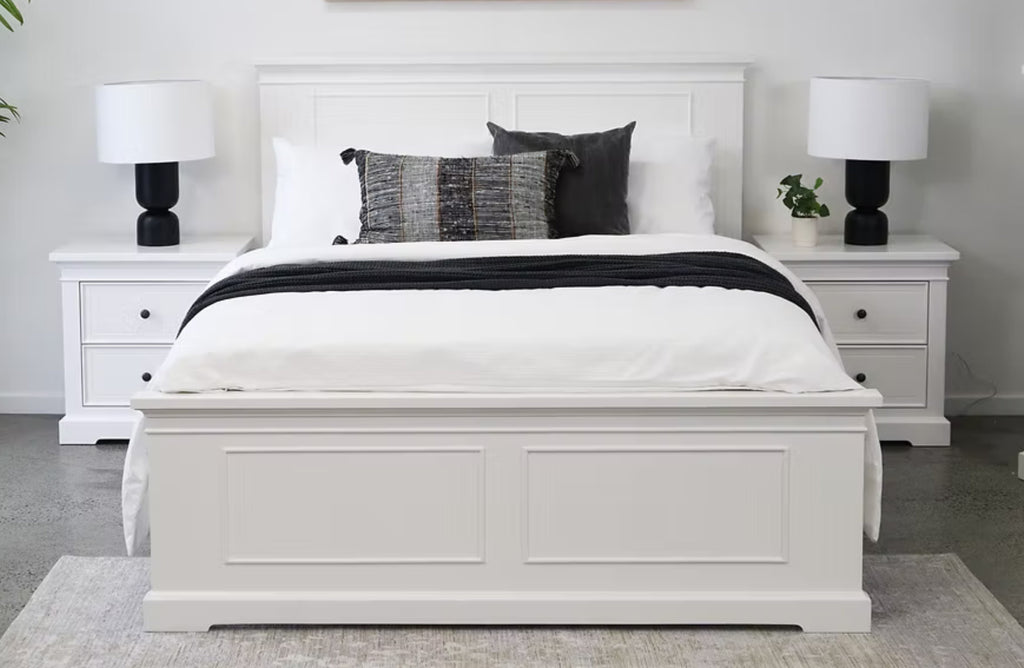 Hamptons white bedroom set featuring bed frame, bedside tables and tallboy in a coastal style.