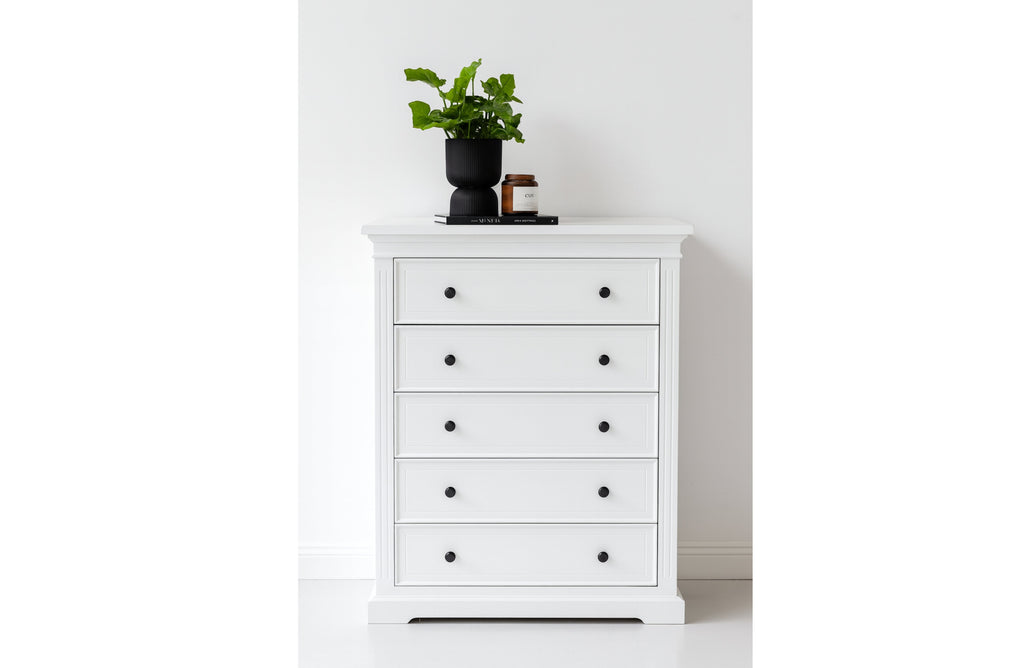 The tallboy features a crisp White finish, panelled detailing and generous vertical storage, making it a stylish and practical addition to your space. Its clean, classic silhouette blends seamlessly with a wide range of interior styles.
