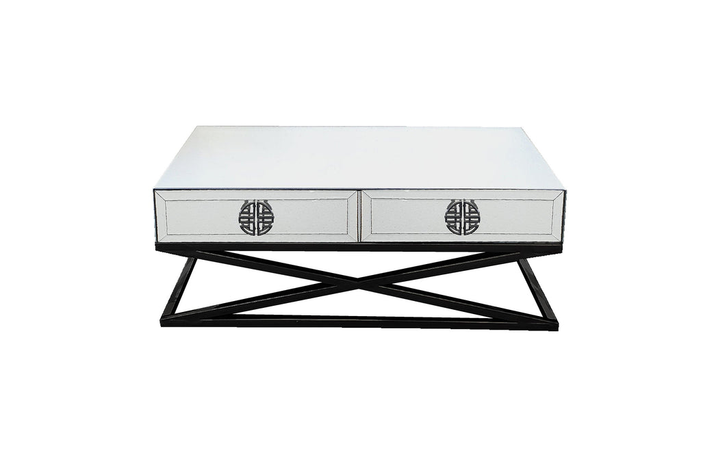 Elegant Athens mirrored coffee table with black crisscross base and dual storage drawers.