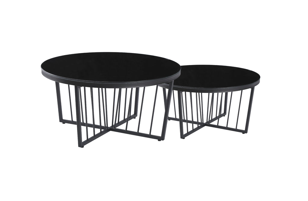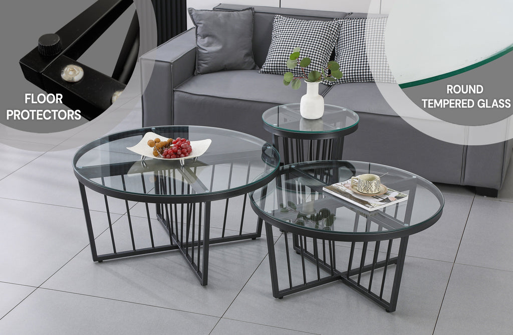 Serena black frame coffee and side table set with clear tempered glass tops.