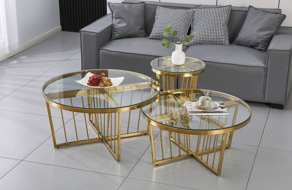 Serena gold polished frame coffee and side table set with clear glass tops.