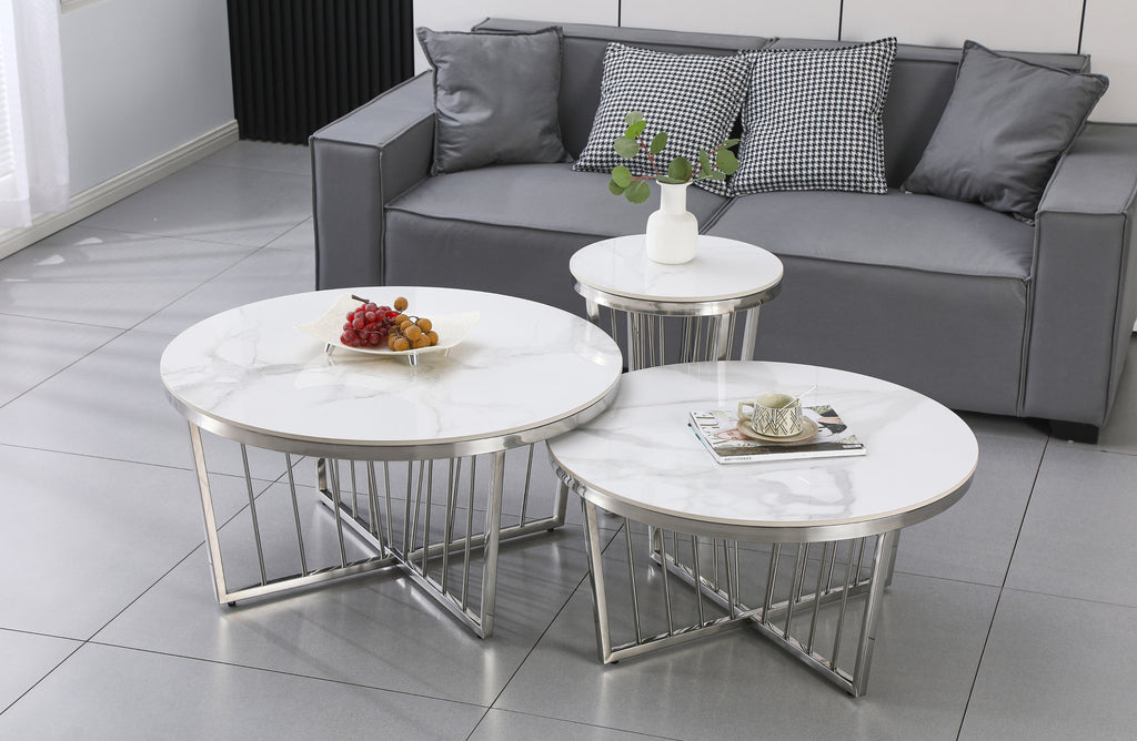 Serena silver polished frame coffee and side table set with white marble stone tops.