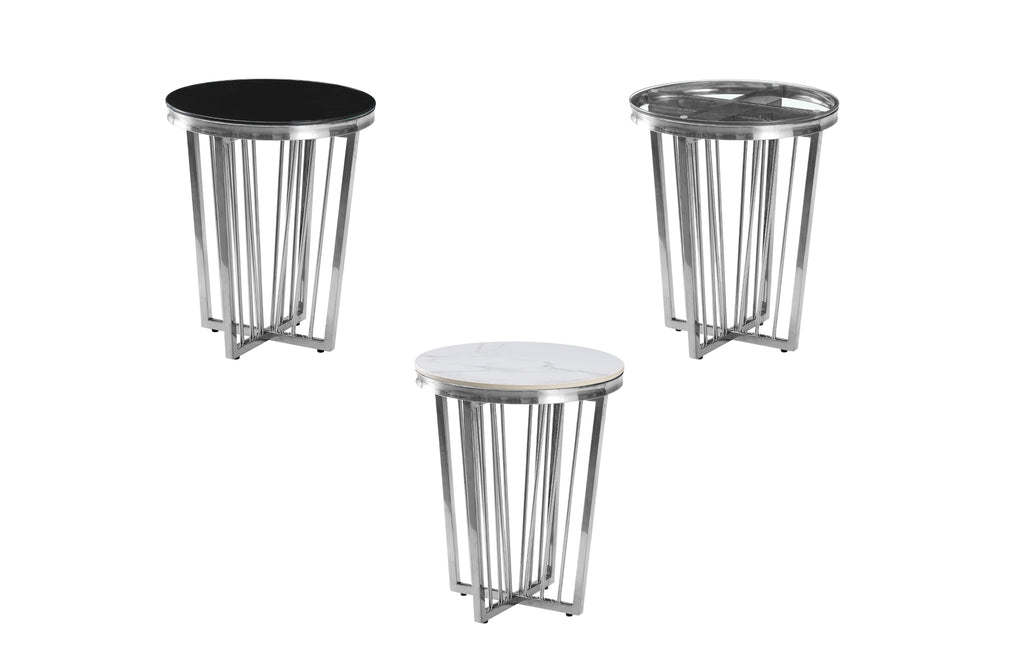 Serena silver frame side tables with black glass, clear glass, and white marble tops.