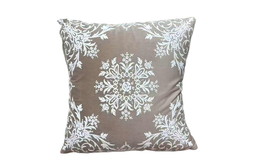 Elegant beige damask velvet cushion with detailed floral pattern, perfect for sophisticated home décor.