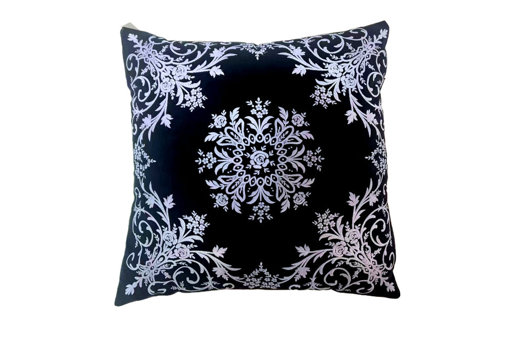 Luxurious black velvet cushion with intricate white damask design, adding style and modern charm.