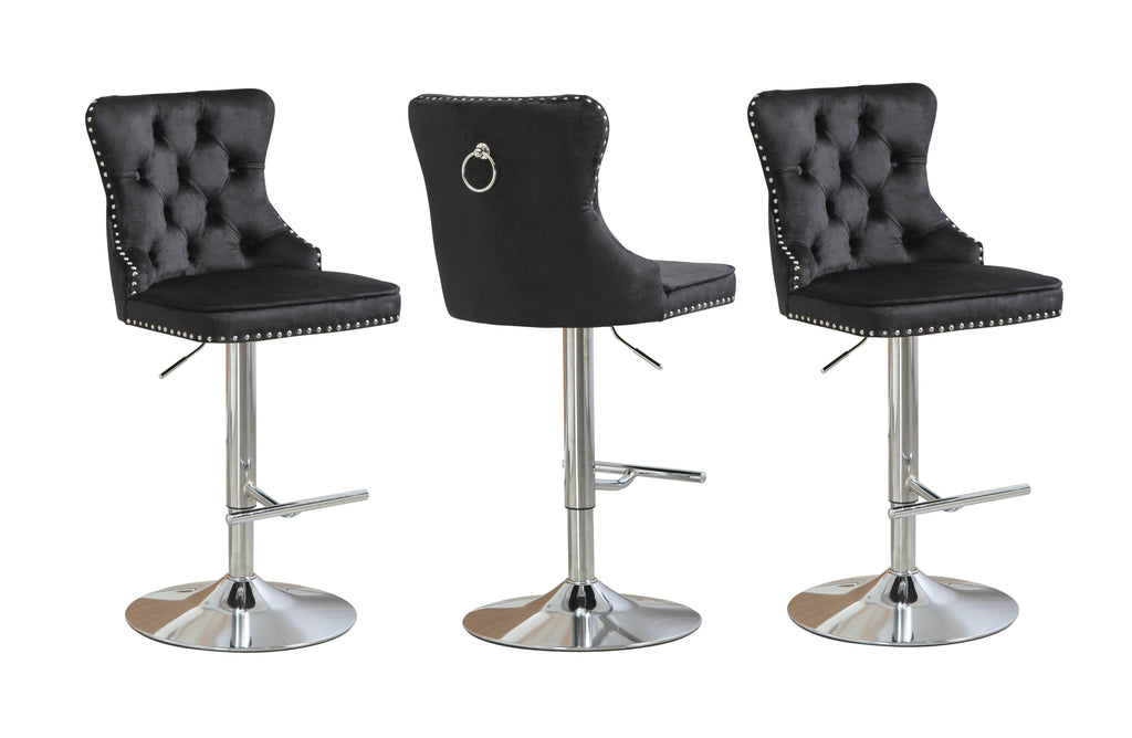 Featuring a sturdy chrome metal base with built-in 360° swivel function and footrest, these bar stools offer excellent stability without scratching or damaging your floor. Choose between black or grey velvet fabric finishes to perfectly match your space. The plastic ring attached to the base prevents it from sliding during use.