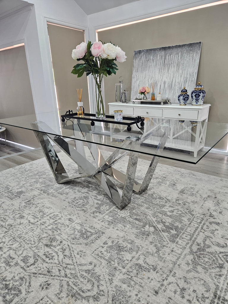 Introducing the stylish Lenox Dining Table in Silver & Gold frame, a perfect choice for those looking to add a touch of elegance to their dining area. With its sleek silver/gold legs and a clear glass top, this table exudes modern sophistication. The dimensions of this table are 240cm X 110cm X 75cm, providing ample space for family gatherings or dinner parties with friends.