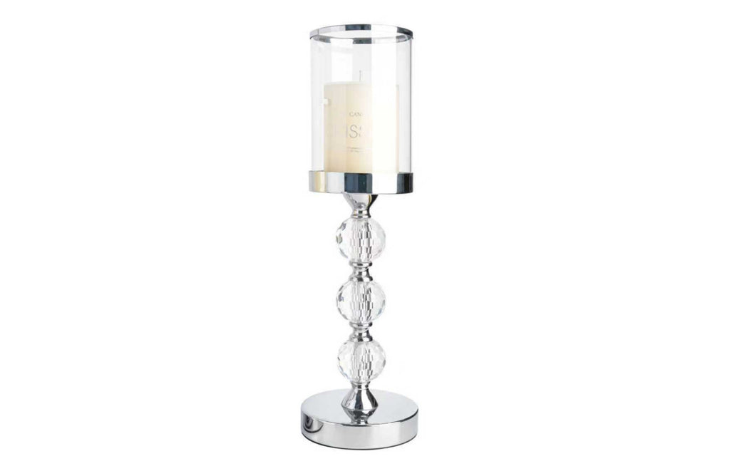 Each piece features a sturdy metallic base and a sleek cylindrical glass shade that securely holds pillar candles. The design is further enhanced by stacked crystal-ball accents that beautifully catch and reflect the light, creating a sparkling display. Ideal for mantels, dining tables, console setups, or event styling, the Zena collection offers an exquisite blend of function and style.