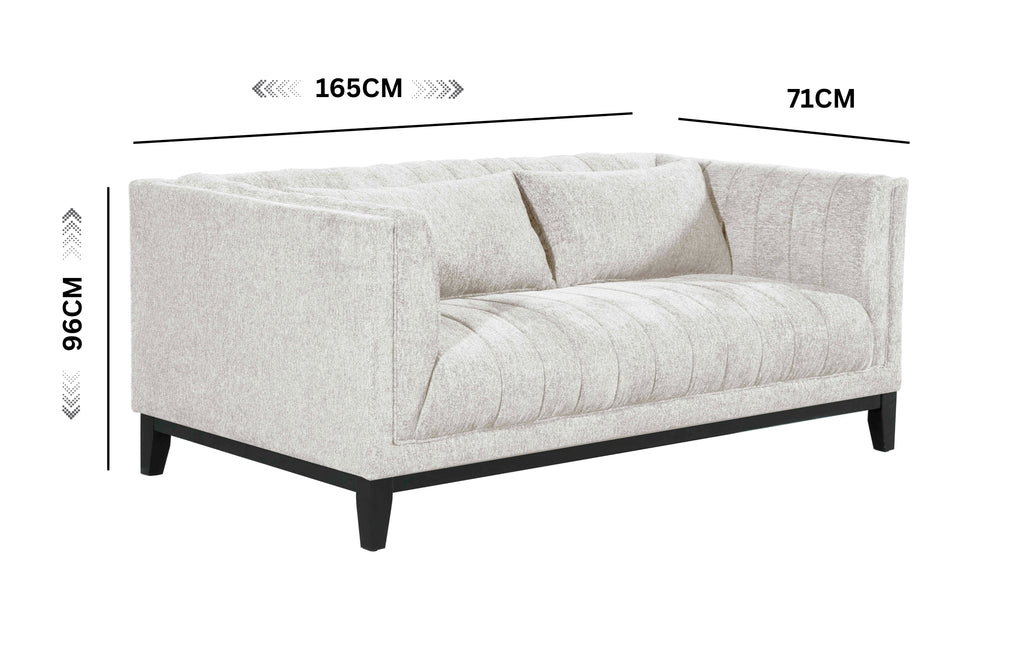Austin Lounge Sofa in Cream – Elegant 2-seater with deep channel tufting and soft cushions, shown with full-size dimensions for a perfect fit.