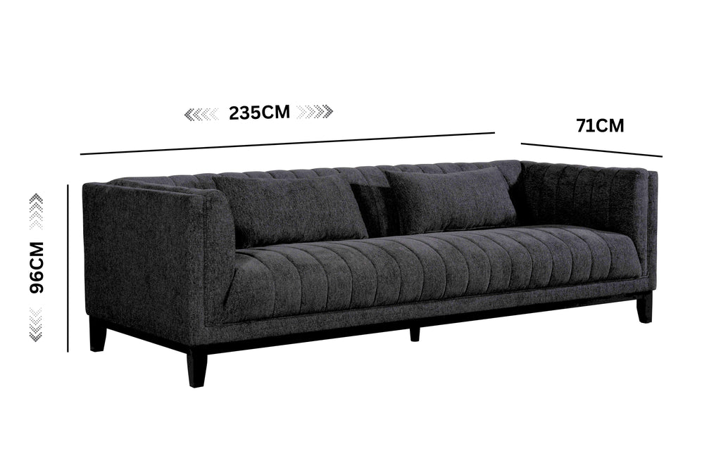 Austin Lounge Sofa in Charcoal – Modern tufted 3-seater with cushion support, shown with dimensions: 235cm width, 96cm height, 71cm depth.