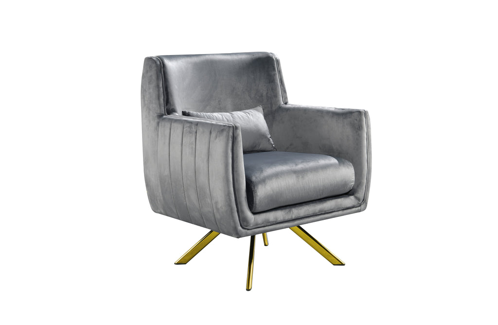 Grey velvet swivel armchair with soft cushioning and contemporary gold base