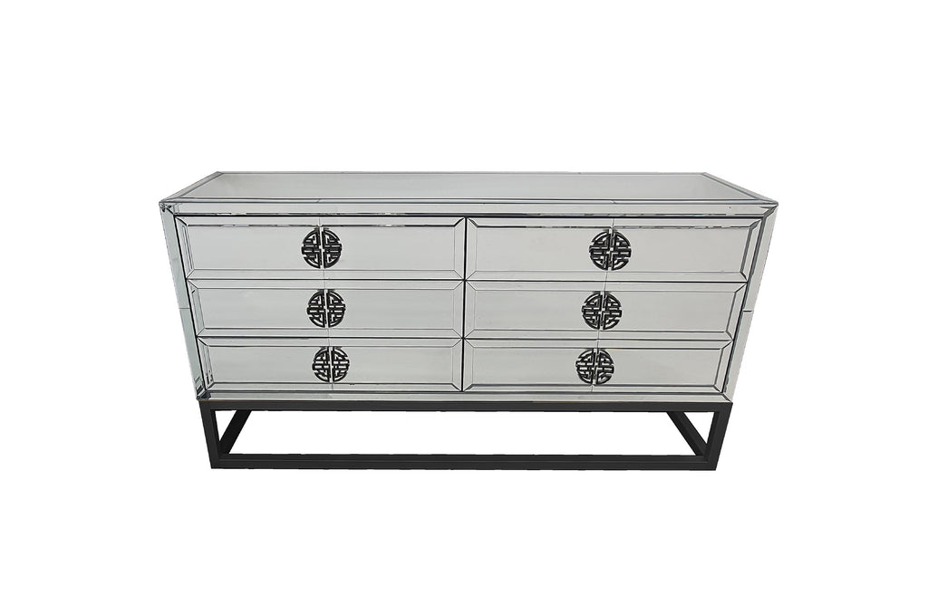 Athens Mirrored Dresser styled with décor items, featuring six drawers and black frame