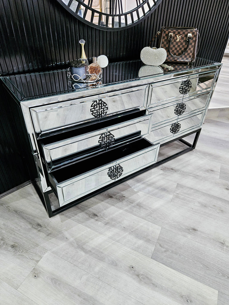 Athens Mirrored Dresser Table with six drawers, black frame and elegant reflective finish