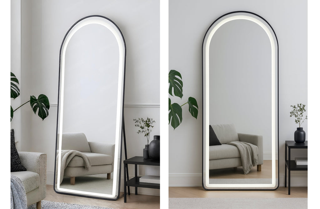 Elevate your space with the sleek and modern Metal Freestanding / Wall LED Mirror in Black. This versatile mirror features a sturdy black metal frame with integrated LED lighting, offering both functionality and contemporary style. Designed to be freestanding or wall-mounted, it adapts perfectly to any room, adding a touch of sophistication and enhanced illumination. Whether placed in a bedroom, hallway, or dressing area, this mirror is a practical yet stylish addition to your home.