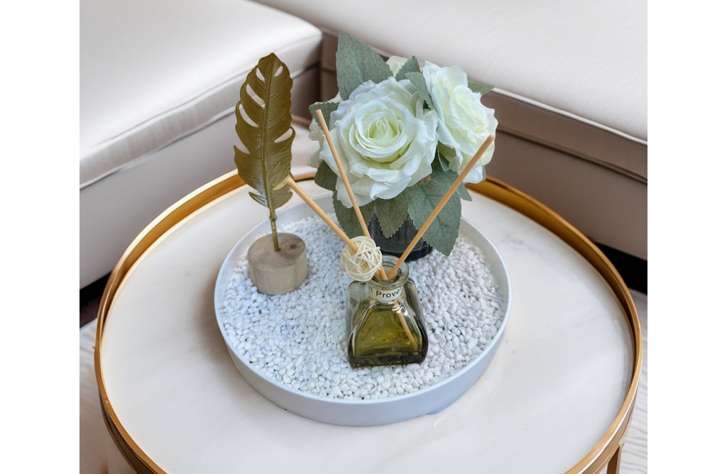 The Bloom Flower Décor Tray & Fragrance Diffuser Set is a thoughtfully arranged decorative piece featuring lifelike artificial flowers, a premium reed diffuser, and smooth accent stones—all displayed on a sleek, shallow tray. Its compact yet elegant design makes it perfect for dressing tables, sideboards, or living room accents. Designed to add a gentle scent and visual harmony, this set blends fragrance and floral style for a calming, polished touch.