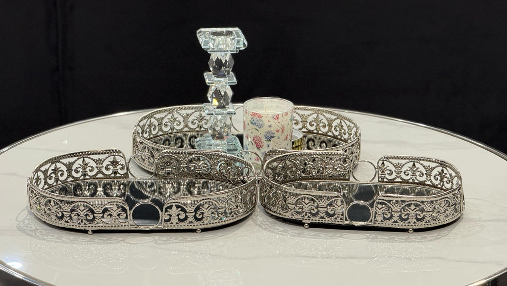 Set of 3 silver oval Lucy trays with elegant filigree edges and mirrored bases – a chic and timeless décor or serving trio.