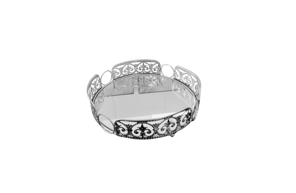 Medium-sized silver oval Lucy tray with intricate detailing and reflective mirror base – stylish and versatile.