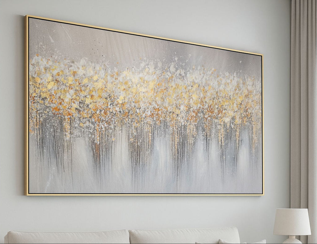 The "Orchard Wall Art" by furniture and giftware is a stunning piece featuring a combination of gold colours along with a gold frame. Here are the details of the Orchard Wall Art: