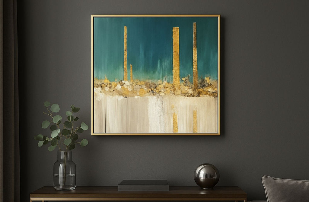 Framed in a sleek metallic-finished border—typically in gold or champagne—this small-sized artwork is ideal for adding elegance to narrow walls, bedside nooks, or gallery wall arrangements. Perfect for modern, coastal, or glam interiors, it adds refined colour and visual interest with ease.