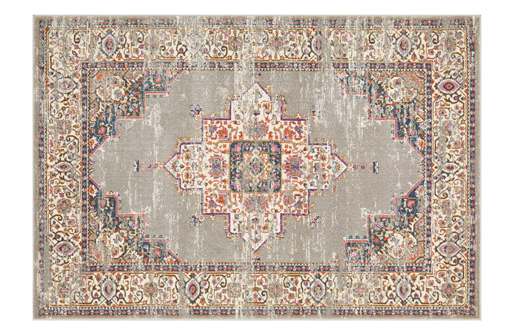 Babylon Grey Rug featuring intricate geometric and floral patterns in silver, grey, blue, pink, and rust tones.
