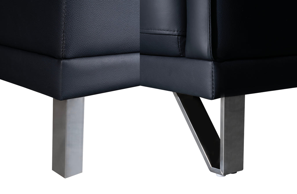 Close-up of Lawson black leather sofa legs showcasing modern stainless steel supports and clean geometric design.