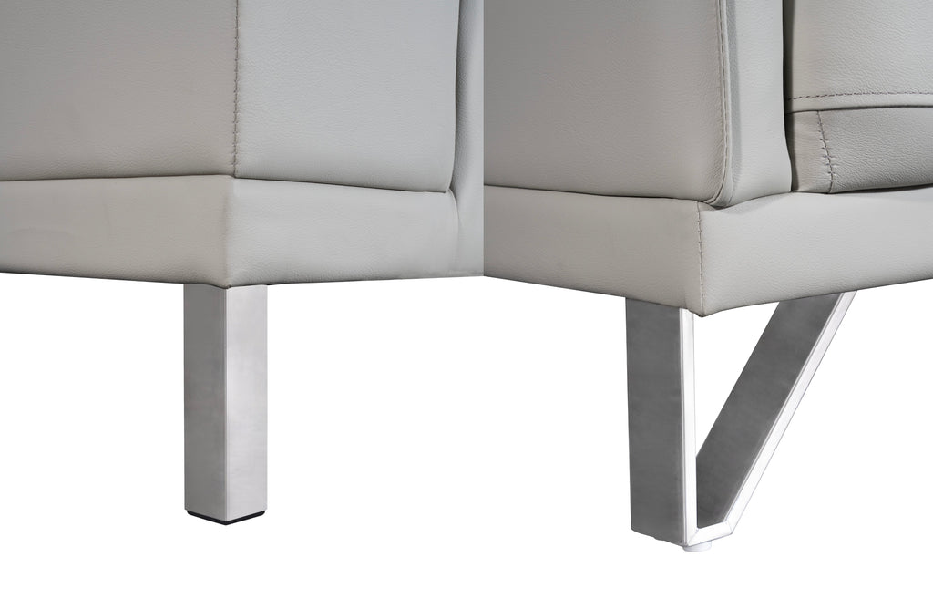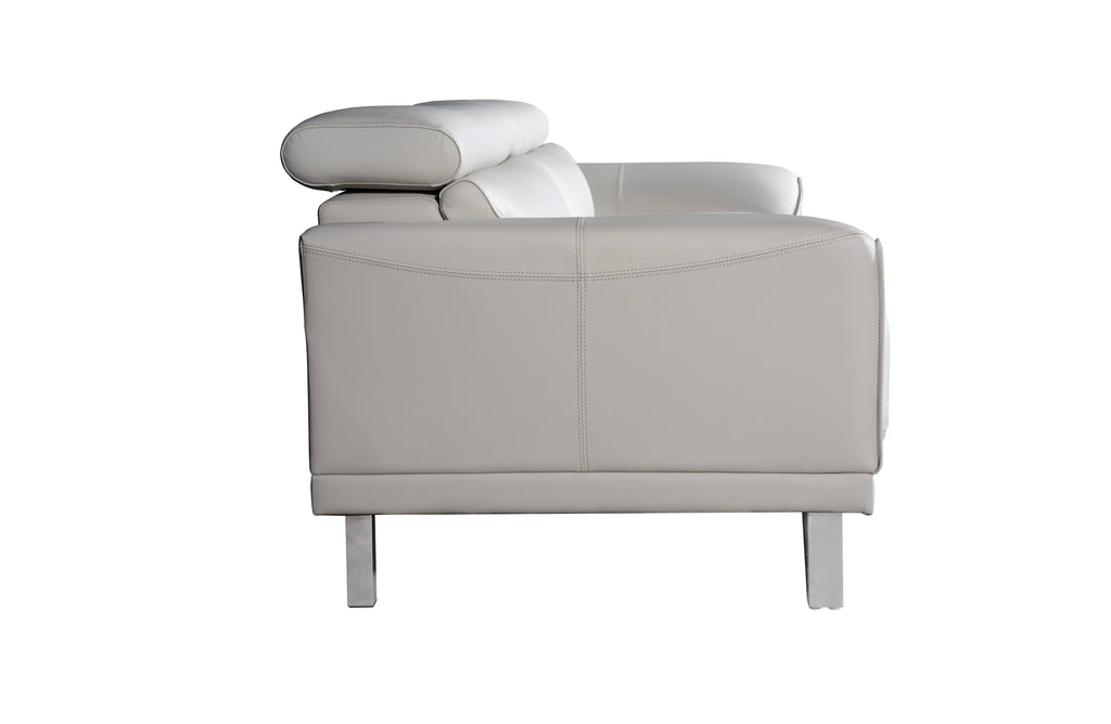 Side view of Lawson light grey leather sofa featuring adjustable headrest and stainless steel legs.