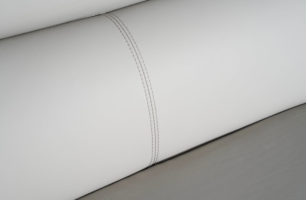 Close-up view of Lawson light grey leather sofa showing fine stitching detail and smooth upholstery.